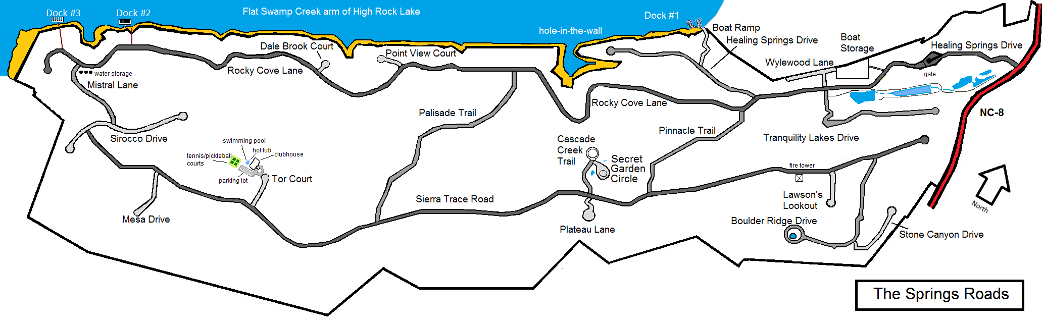 Our clubhouse is located at the summit and has panoramic views of High Rock Lake. On a clear day one can see the Blue Ridge Mountains more than 100 miles away. Its balcony overlooks the adjacent pool, hot tub and the tennis/pickleball courts as well as thirty-five acres of forest preserve. Take a photo tour of the Clubhouse and meander the Street Map of The Springs.