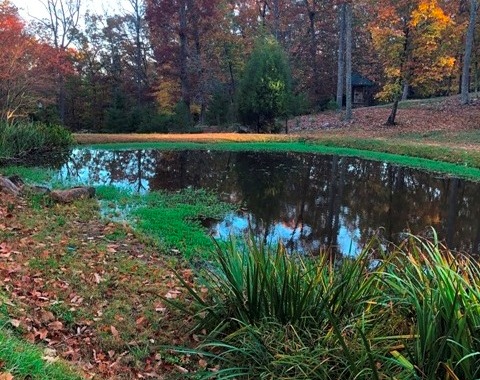 Cascade Creek Park is a beautiful, serene area of The Springs with two ponds, woods, a firepit, and a picnic area with a fireplace and gazebo. There is a walking path, but it is rather undefined. The path starts close to the picnic area, goes up the hill, around where the upper pond used to be, and meanders down the other side of the pond. Although the path is rather unbeaten, nature provides quite a show. There is a lovely assortment of plants near and in the water – some of which are native to North Carolina. There you can find pickerelweed with the big, heart-shaped leaf; a clump of rushes; some jewelweed; and some spreading dayflowers creeping around the pond’s edge to name a few. The evergreen bushes along the path include a rhododendron that bursts with blooms in the spring.